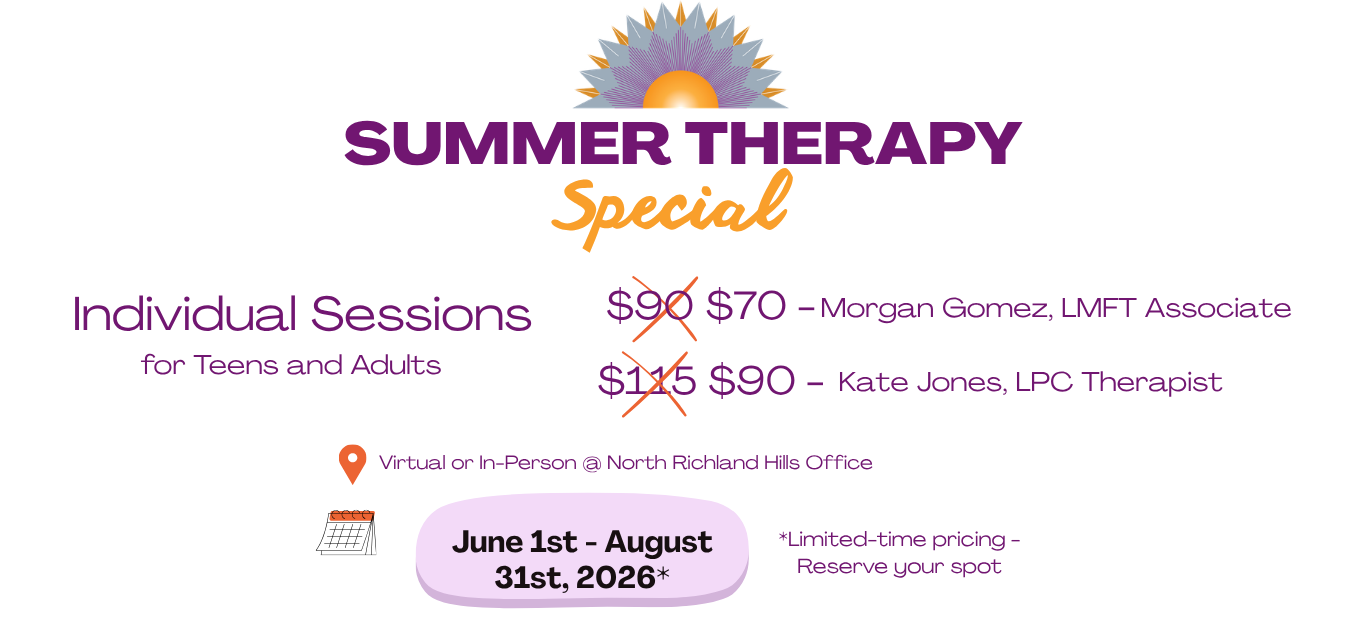 Our office is based out of North Richland Hills and serves Fort Worth and surrounding areas. Can’t make it into the office? No worries – we’ve got you covered with teletherapy.